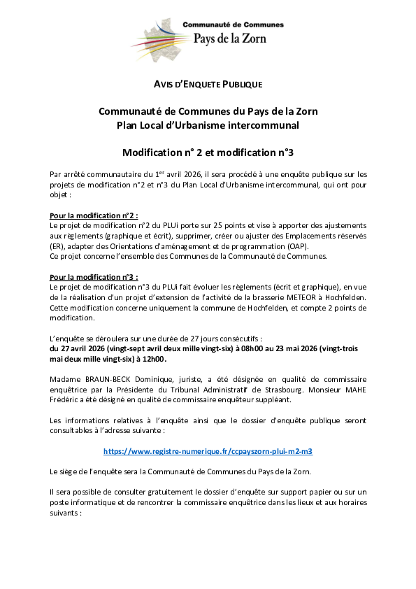 Waltenheim-sur-Zorn > Actualités > Enquête publique - Modification n°2 et 3 du PLUi